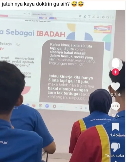 Namun motivasi ini sampai pada penyampaian sebuah kalimat “Kerja sebagai ibadah”. Penyampaian ini tentu menimbulkan pro dan kontra pada masyarakat. Di satu sisi, masyarakat setuju dengan motivasi tersebut untuk meningkatkan loyalitas karyawan di tempat dia bekerja. Di sisi lain, masyarakat yang kontra menilai bahwa kalimat tersebut sebagai bentuk doktrin dengan membawa agama sebagai senjata seperti kata-kata yang tertera “jika kinerja 5 juta tapi 10 juta, maka 5 juta akan diambil melalui sakit, dll). Menurut masyarakat yang kontra, kata-kata ini merupakan senjata untuk menenangkan karyawan untuk tidak boleh mengeluh, dianggap kurang iman jika menuntut hak.