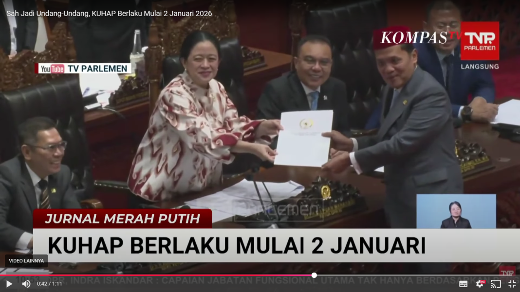Selasa, 18 November 2025, DPR secara resmi mengesahkan Undang-Undang Kitabh Hukum Acara pidana (KUHAP) bersamaan denga KUHP yang akan berlaku mulai dari 2 Januari 2026. Reformasi hukum pidana Indonesia melalui pengesahan KUHP baru tentunya menjadi salah satu perubahan legislasi paling signifikan sejak masa kolonial.